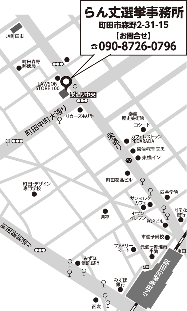 選挙にあたりまして、下図のように、森野2-31-15に事務所を構えます(栄通りと町田市民ホールから上がる道の栄通り中央交差点、オリジン弁当隣)。