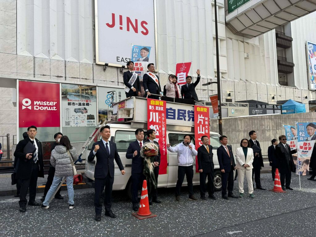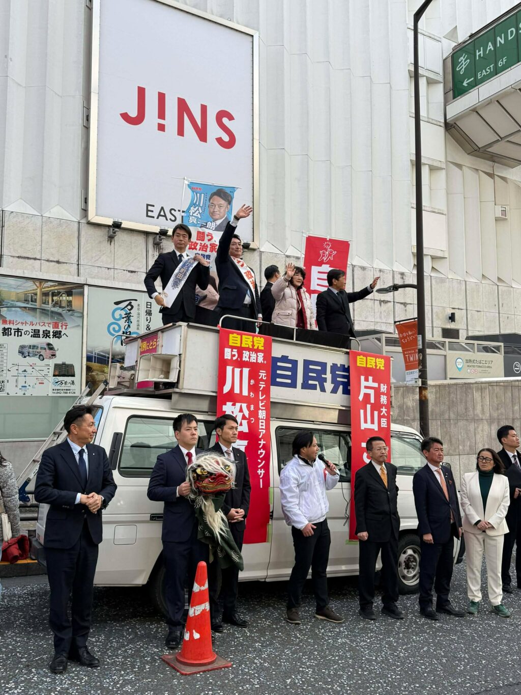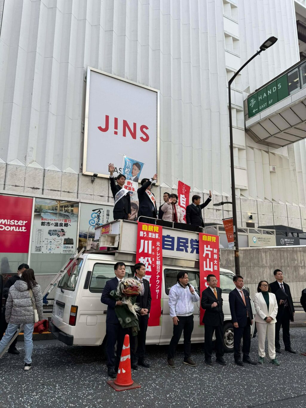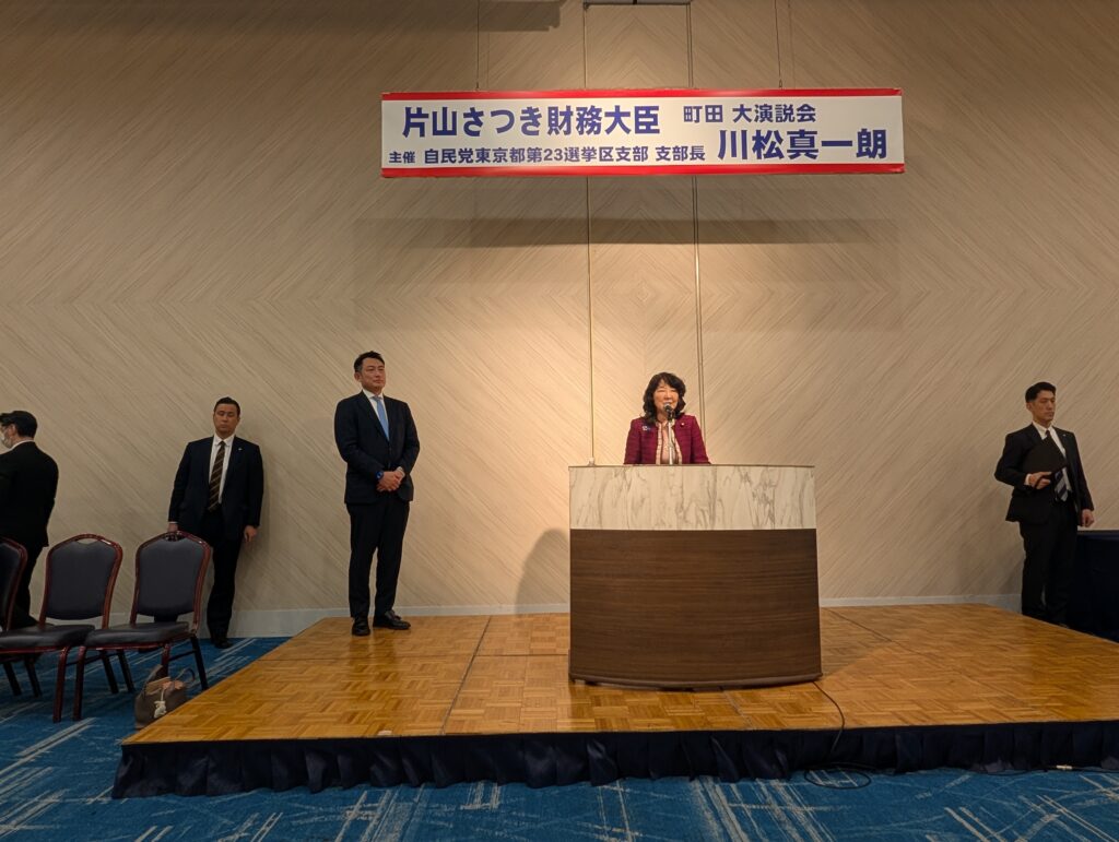 本日は、わが国の憲政史上初めての女性財相、片山さつき大臣が、自由民主党東京都第23選挙区支部長、川松真一朗さんのために、公務御多忙のところ、町田までお越しくださいました。 御蔭様で、寒中厳しき折、多くの聴衆が宣伝車を取り囲んでくださいまして、応援演説を聞き入ってくださいました。