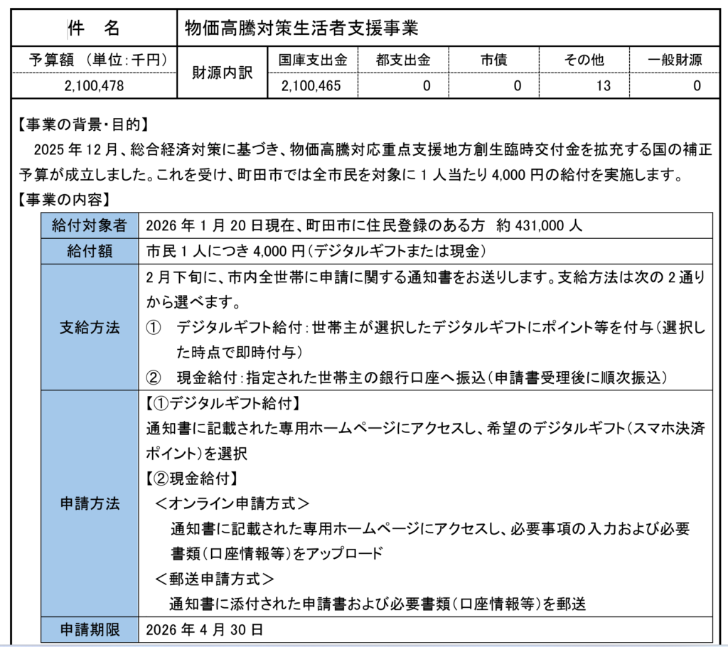 2025年12月に、物価高騰対応重点支援地方創生臨時交付金が拡充されたことを受けて、町田市では、生活者支援・事業者支援の事業費等を計上いたします。