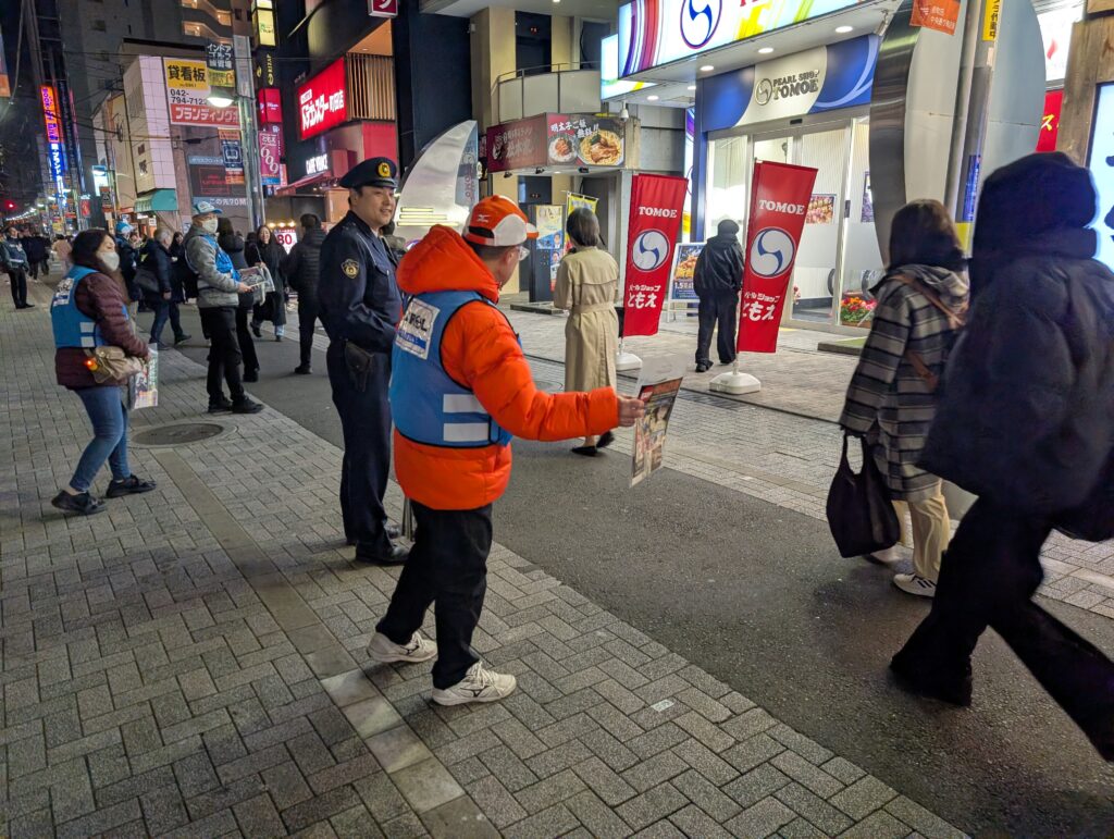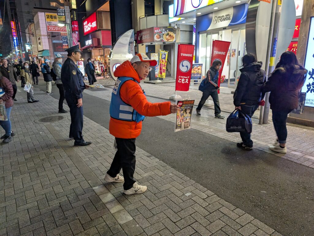 町田市では、中心市街地の風紀保全や繁華街の治安対策のため、市民の皆様や各関係団体のご協力を得て、官民協働啓発活動を実施しております。 市民ボランティアと町田市と町田警察署、各関係団体との協働による、町田駅周辺の中心市街地での防犯啓発活動(チラシ配り)を実施しています。