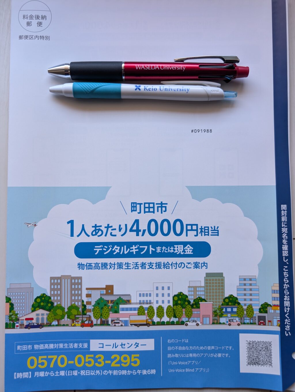 我が家にも、物価高騰対策生活者支援給付のご案内が届きました。 物価高騰の影響を受ける市民の生活者支援として、町田市民全員を対象に1人4,000円相当を給付します。