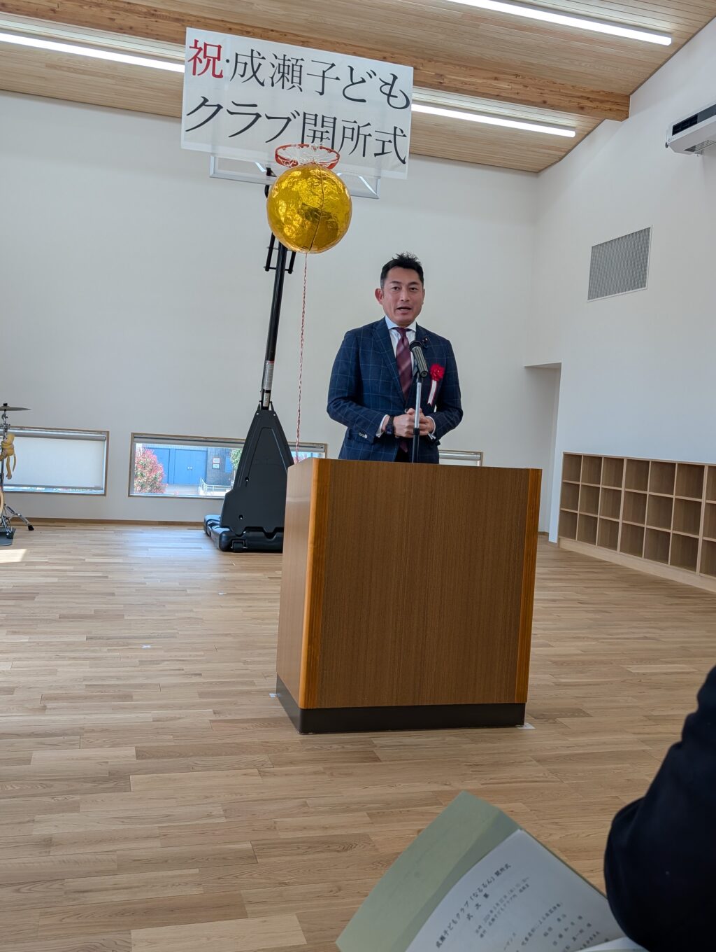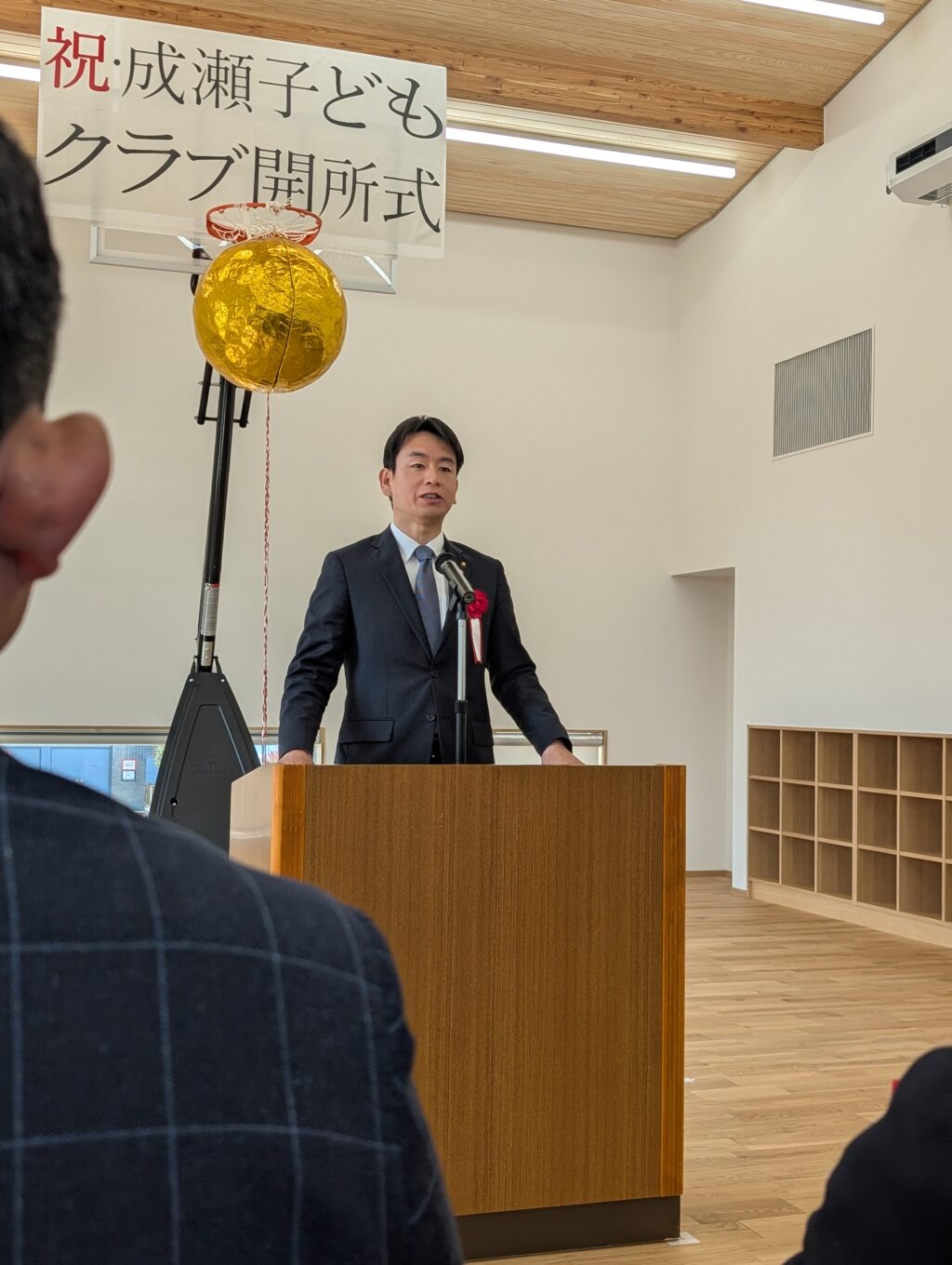 先日、成瀬子どもクラブ「なるるん」の開所式が開催されたので、副議長として参加させていただきました。 稲垣市長のご挨拶から、式典がはじまりました。