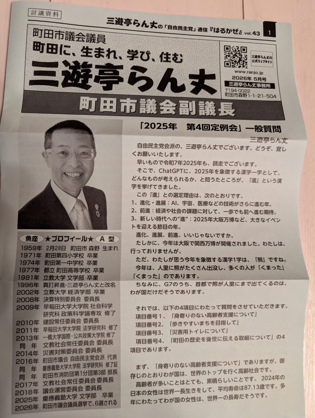 自由民主党会派の、三遊亭らん丈でございます。どうぞ、宜しくお願いいたします。