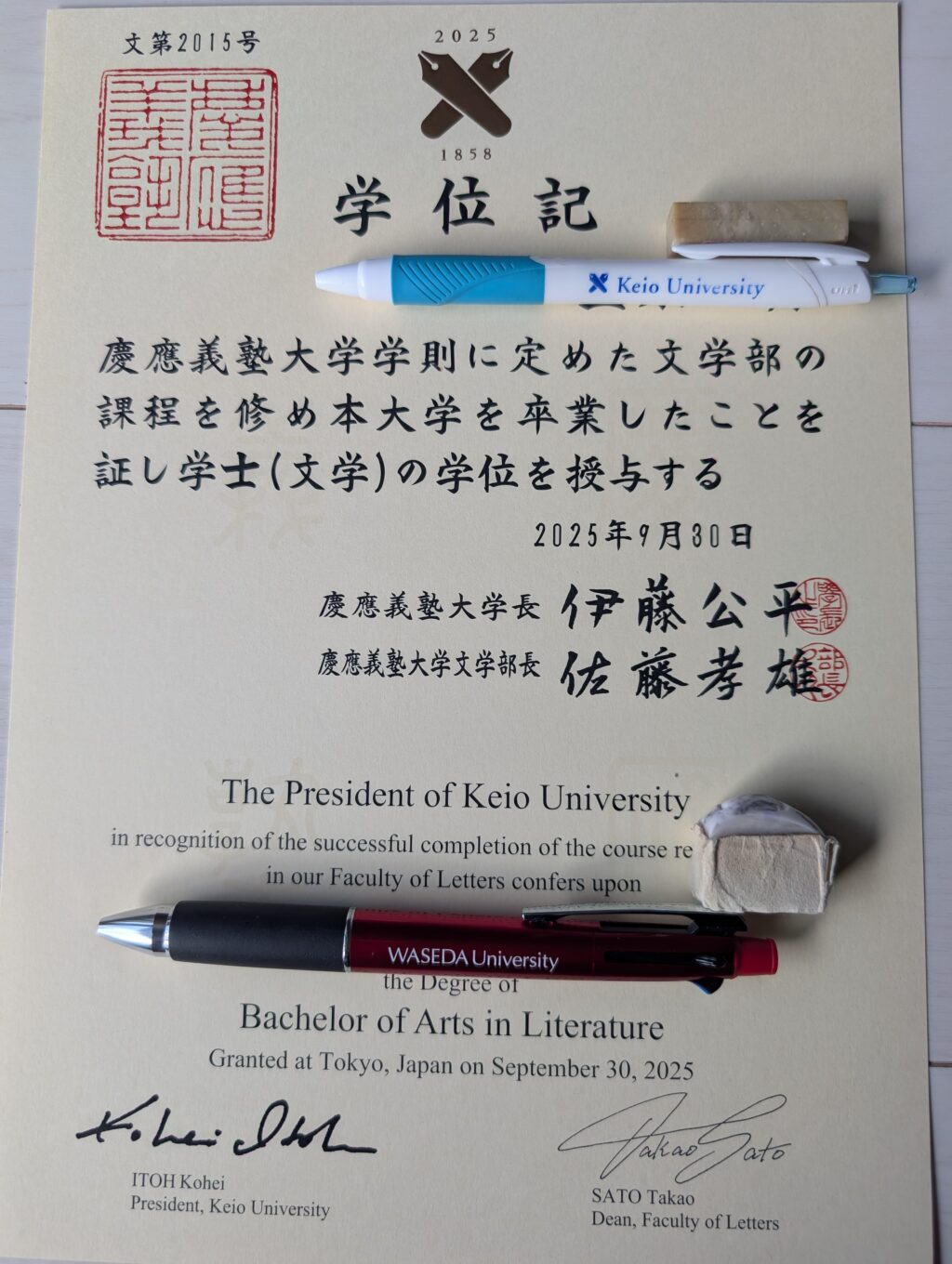 | 2002年 | 3月 | 立教大学 経済学部 経済学科 ゼミナール「現代地方財政の研究」 卒業「学士(経済学)」⇒単位修得科目 紫紺地に白色の十字架と左肩に金色の「立」が描かれている校旗 |